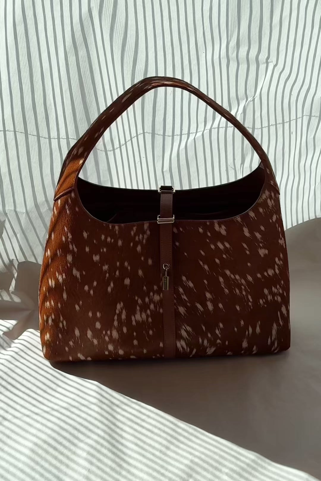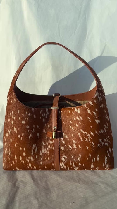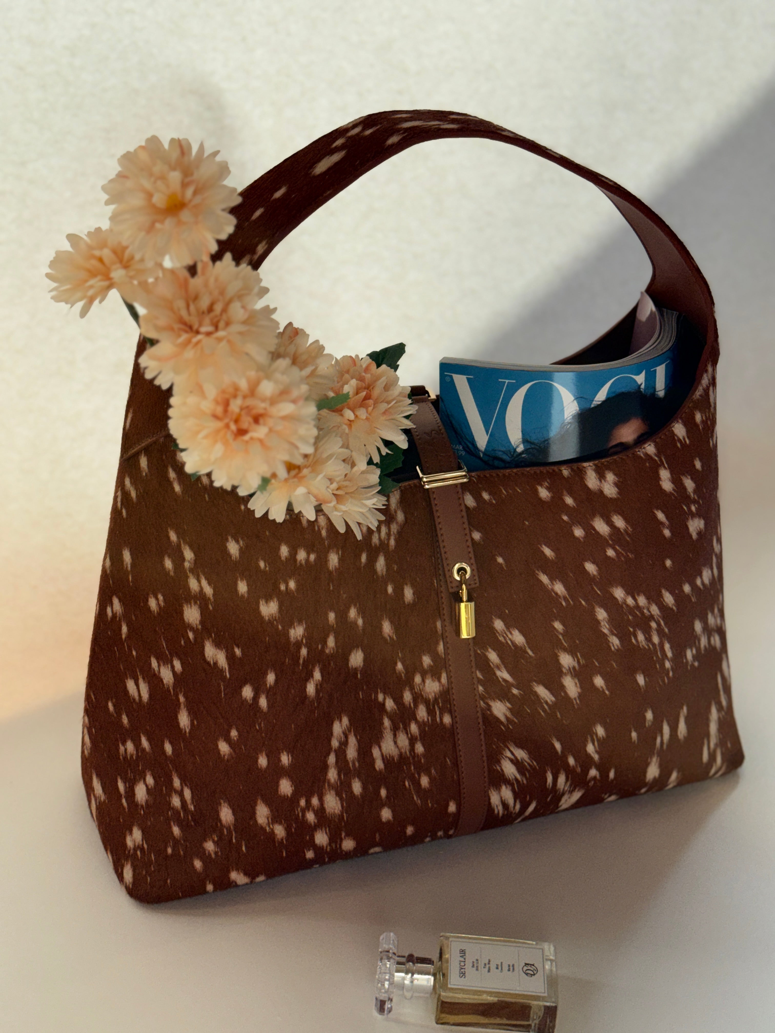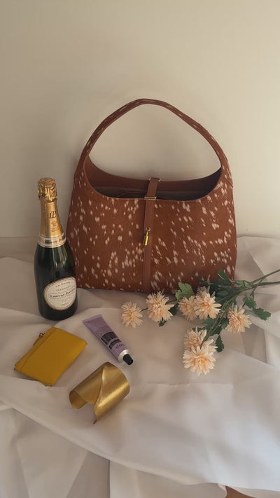 Notre sac Natasha, un best-seller, se pare d'un imprimé cerf original, apportant une touche d'audace à la silhouette que vous aimez déjà. Elle contient tout le nécessaire pour le travail : carnet, portefeuille, clés, trousse de maquillage et une bouteille de champagne. Que vous soyez adepte du maximalisme et que vous l'associais à un mélange d'imprimés, ou que vous la portiez comme pièce maîtresse de votre tenue, elle est l'accessoire idéal pour compléter votre look du jour. Son motif inspiré du cerf est obtenu grâce à un traitement spécial du cuir australien naturel. Les variations de taches, de marques et de texture font partie de son caractère naturel ; chaque pièce est unique.